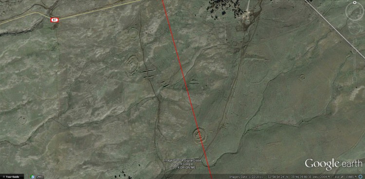 Between the Giants Wheel and the foothills of Mount Hermon the land is scared with many unusual earthworks. I marked the satellite image with a straight red line going from the center of Wheel of Giants, to Pans Grotto. It passes directly through some of the earthworks in the same way that Tumuli are found along lay-lines leading to Stone Henge.